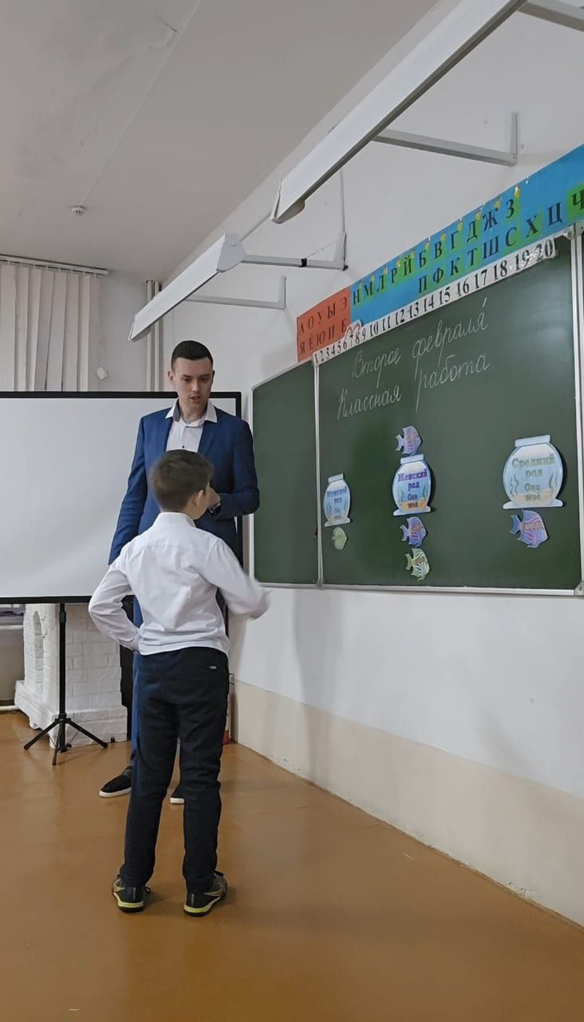 Балалар жалыға бастаса, бірден тәсілін ауыстырады: қолына сұрақтары бар шляпа не микрофон алып, сабақты викторинаға немесе сұхбатқа айналдырады. Шағын сыйлық ретінде — кәмпит береді және күрделі терминдер қолданбауға тырысады. Мектептегі мультимедианы — проектор, сабвуфер, аудиокітаптарды жиі пайдаланады.